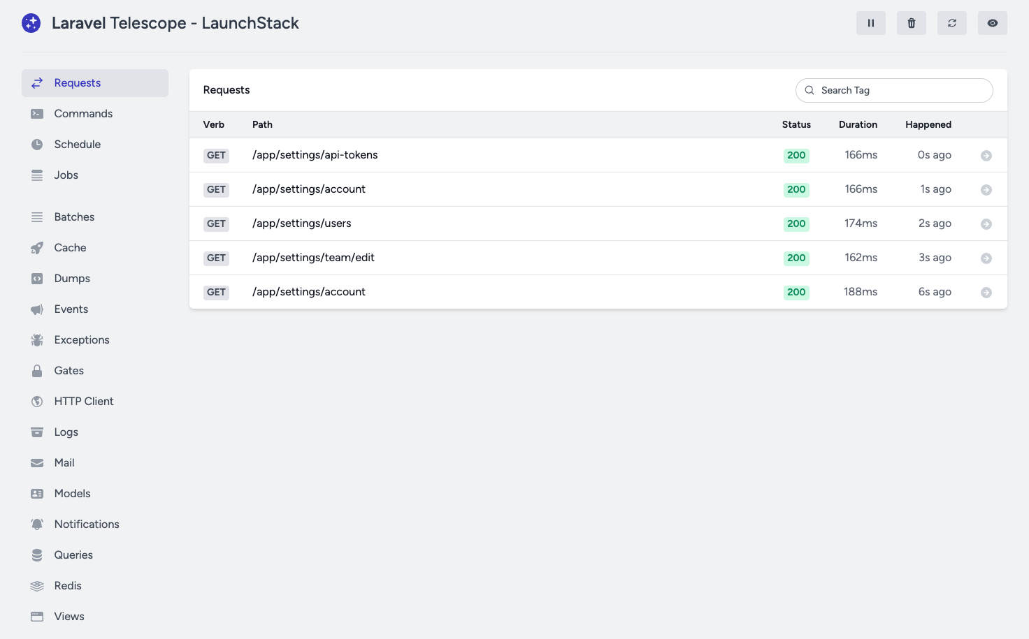 The LaunchStack comes with Laravel Telescope as default for debugging your application like:
